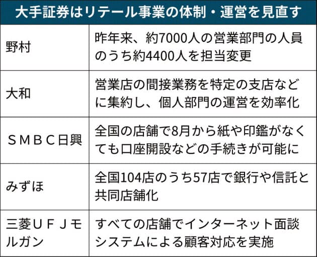 大手証券が個人営業部門の体制や運営の改革に動き出した。大和証券は2020年度中に営業店で間接業務を担う人員を半分にし、直接顧客と接する仕事に振り向ける。野村証券は店舗の統合を進める一方、約7000人
